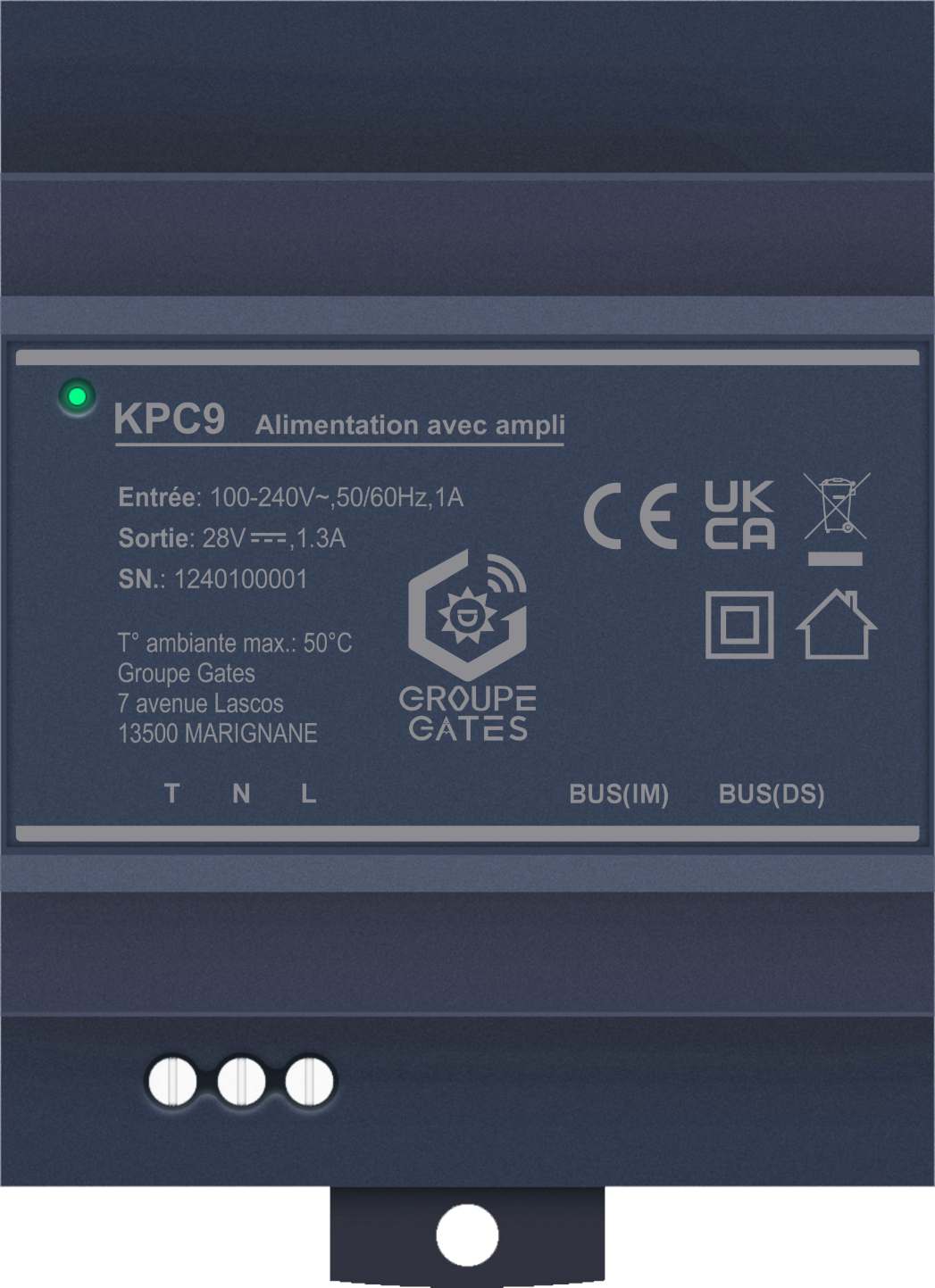 Alimentée en 230VAC et fournissant une tension BUS nominal de 24VDC. Grâce au potentiomètre, la tension est ajustable pour s'adapter aux installations. Cette flexibilité s'avère particulièrement utile pour les distances importantes, avec une intensité délivrée jusqu'à 1,5A.
